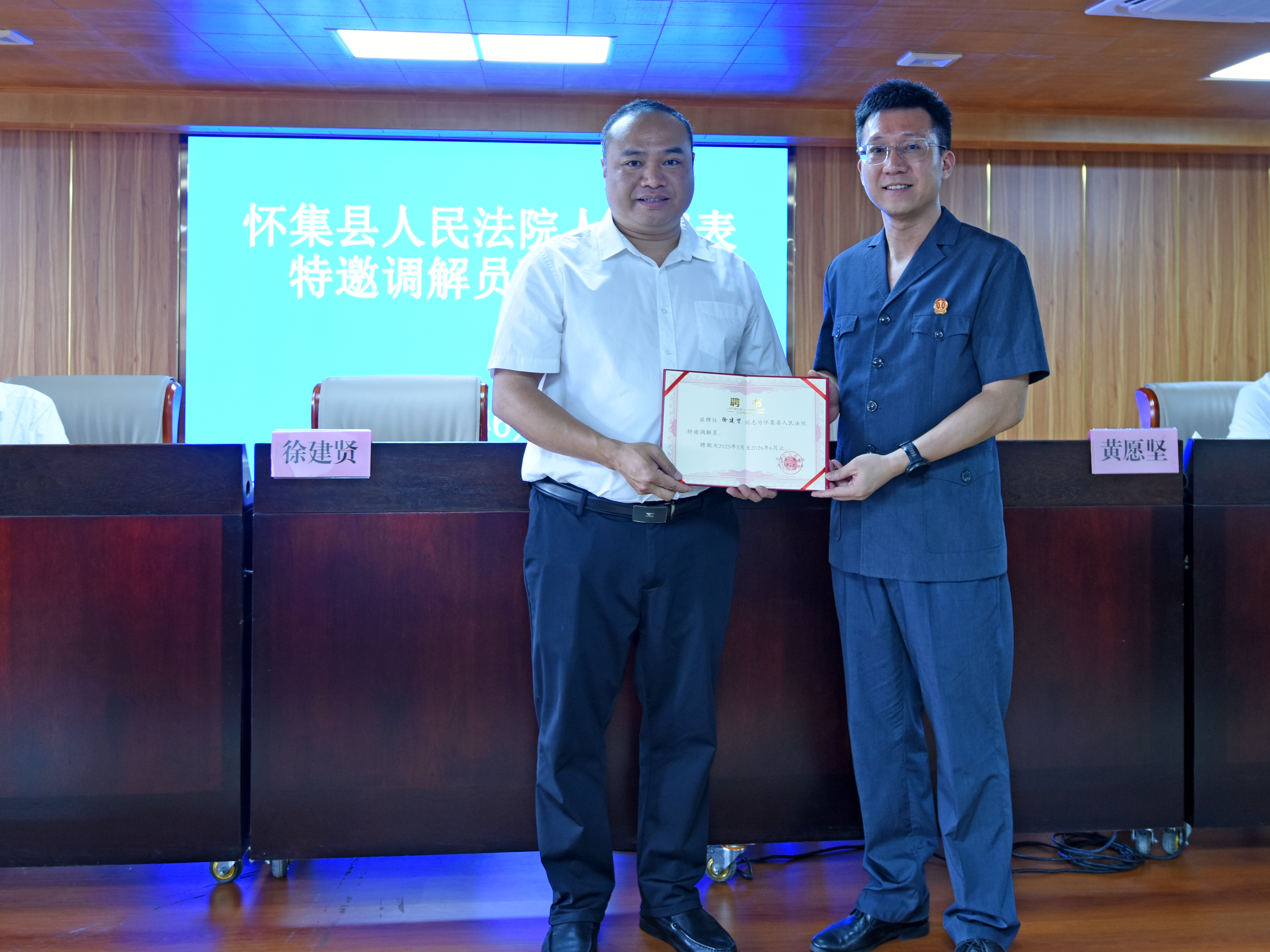 当天还为来自各行各业的人大代表颁发了特邀调解员聘书。他们中既有深耕基层的社区工作者、精通法律的专业人士,还有热心公益的企业家。特邀调解员的加入为怀集法院调解队伍注入了新的活力。
