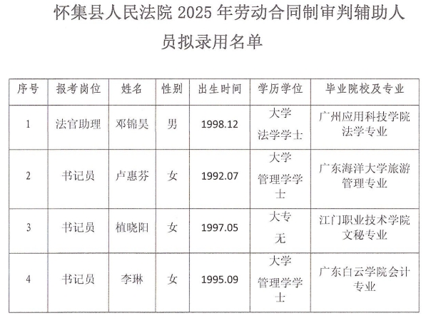 根据《怀集法院2025年公开招聘劳动合同制审判辅助人员公告》安排,经资格审核、考试、面试、体检和考察,拟确定邓锦昊等4名同志为怀集县人民法院劳动合同制审判辅助人员(具体名单附后),现予以公示。