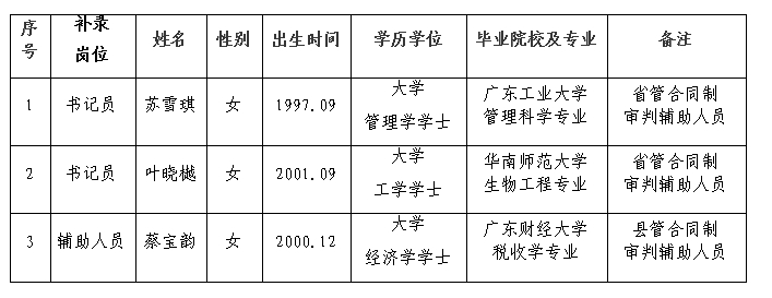 怀集县人民法院2025年拟递补录用合同制辅助人员名单公示