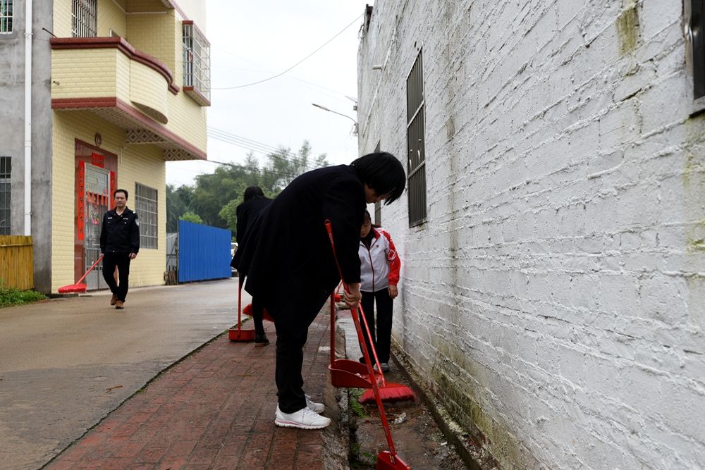 志愿者们个个干劲十足,他们有的清扫村道路面垃圾,有的清理路边杂草,有的清洗宣传栏玻璃……现场一片热火朝天的景象。经过清洁打扫,村道和法治讲堂变得干净整洁、焕然一新。